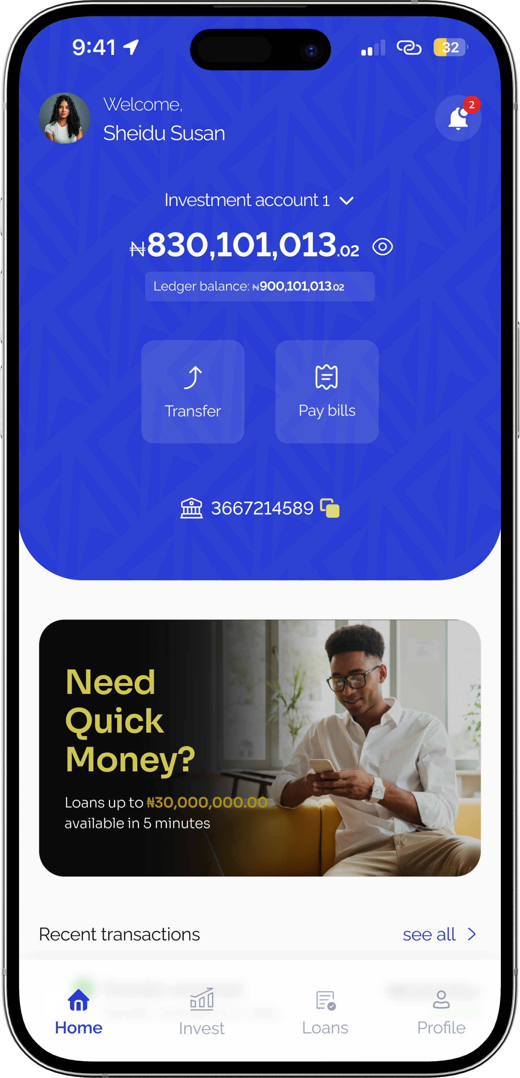 Save for your goals, invest for growth, and access loans for personal and business needs. All in one place.